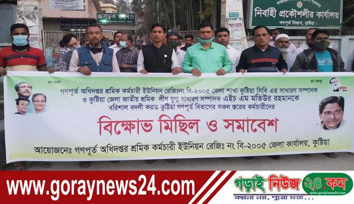 কুষ্টিয়া জেলা জাতীয় শ্রমিক লীগের যুগ্ম সাধারণ সম্পাদক এইচ এম মতিউর রহমানকে হঠাৎ বদলি করায় ক্ষুব্ধ হয়ে কুষ্টিয়া গণপূর্ত বিভাগের সকল স্তরের কর্মচারীরা বিক্ষোভ মিছিল ও সমাবেশ করেছে৷