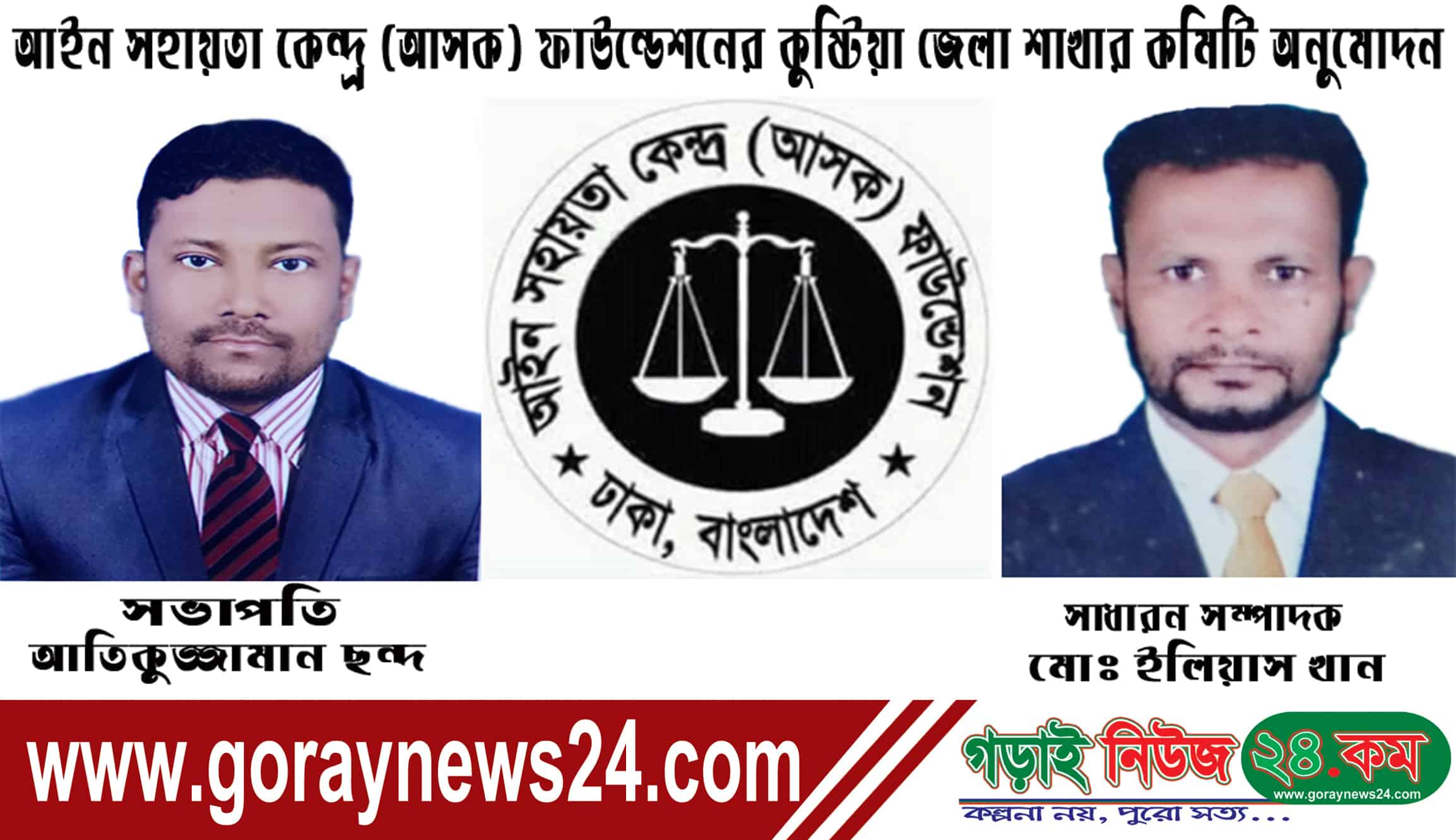 কুষ্টিয়া অফিস, গড়াইনিউজ২৪.কম:: আন্তর্জাতিক মানবাধিকার সংস্থা আইন সহায়তা কেন্দ্র (আসক) ফাউন্ডেশনের ১৪ সদস্য বিশিষ্ট কুষ্টিয়া জেলা শাখার কমিটি অনুমোদন। এ কমিটিতে ১ জন সভাপতি ২ জন সহ সভাপতি ১ জন সাধারন সম্পাদক সহ ১০ জনকে কার্যনির্বাহী কমিটি করে অনুমোদন দিয়েছেন।