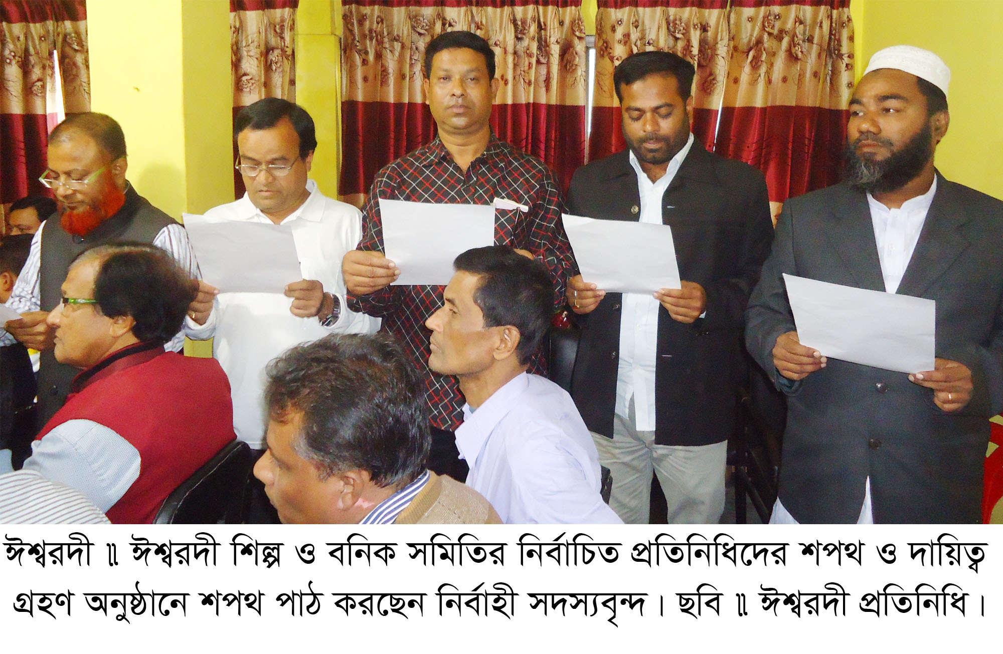 ঈশ্বরদী শিল্প ও বণিক সমিতির নির্বাচনে দায়িত্বরত প্রধান নির্বাচন কমিশনার হায়দার আলীর সভাপতিত্বে শপথ ও দায়িত্ব গ্রহণ অনুষ্ঠানে বিশেষ অতিথি হিসেবে উপস্থিত ছিলেন ঈশ্বরদী পৌরসভার মেয়র আবুল কালাম আজাদ মিন্টু ও পৌর আওয়ামীলীগের সাধারন সম্পাদক ইসাহক আলী মালিথা। এছাড়া আরও উপস্থিত ছিলেন নির্বাচন কমিশনার হাবিবুর রহমান, অ্যাডভোকেট মনোয়ার হোসেন স্বপন, আব্দুল লতিফ ও এনামুল হক জিন্নাহ সাংবাদিক জাহাঙ্গীর আলম, শেখ মহসিন ও মহিদুল ইসলাম। বক্তব্য রাখেন নব-নির্বাচিত সভাপতি শফিকুল ইসলাম বাচ্চু, সহ-সভাপতি ইউনুস আলী মিন্টু, নির্বাহী সদস্য কে এম আবুল বাসার, আনোয়ার হোসেন জনি, সেলিম আহমেদ ও মেহেদী হাসান লিখন। সাংবাদিকদের মধ্যে বক্তব্য রাখেন আলাউদ্দিন আহমেদ, হাসানুজ্জামান, সেলিম সরদার ও আব্দুল বাতেন। ব্যবসায়ীদের মধ্যে বক্তব্য রাখেন লিয়াকত আলী কনক ও ওবায়দুর রহমান পুলক। ১৭ ডিসেম্বরের নির্বাচনের আগে বিনাপ্রতিন্দ্বিতায় শফিকুল ইসলাম বাচ্চু সভাপতি ও ইউনুস আলী মিন্টু সহ-সভাপতি নির্বাচিত হন।