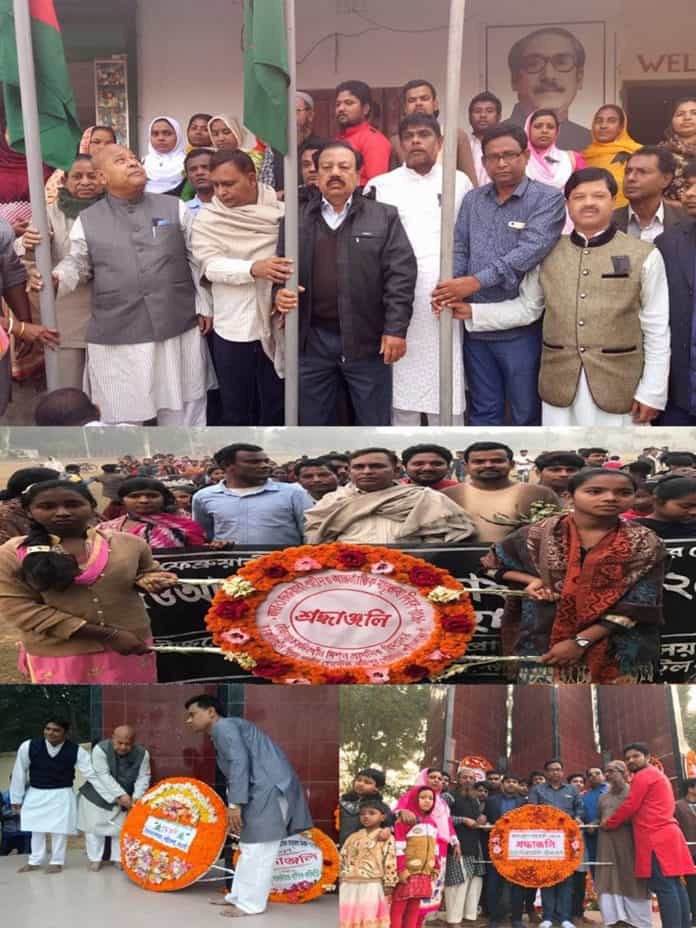 ছবি: পত্নীতলা (নওগাঁ): নওগাঁর পত্নীতলায় শহিদ মিনারের বেদি ফুলে ফুলে ভরে শ্রদ্ধাঞ্জলিতে।