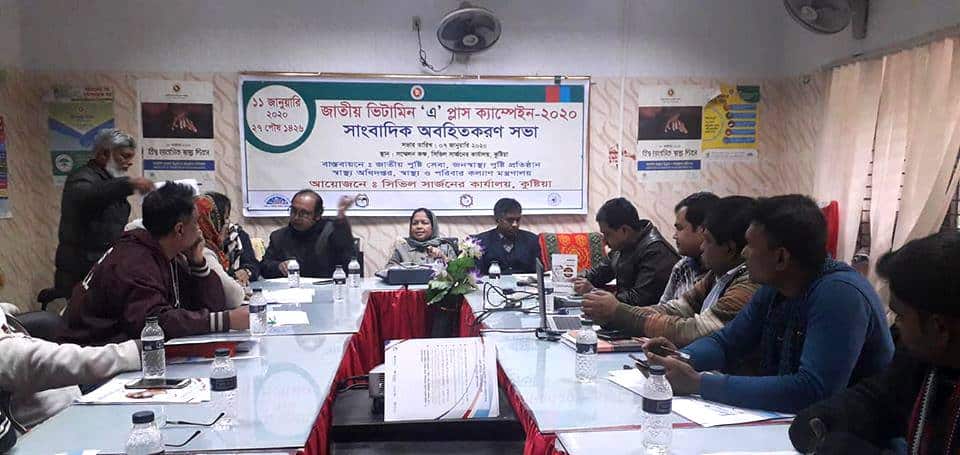 কুষ্টিয়া অফিস, গড়াইনিউজ২৪.কম::আজ মঙ্গলবার সকালে কুষ্টিয়া সিভিল সার্জনের কার্যালয় সভাকক্ষে সকাল ১১ টার সময় জাতীয় ভিটামিন-এ প্লাস ক্যাম্পেইন ২০২০ এর সাংবাদিকদের অবহিত করণ সভা অনুষ্ঠিত হয়। উক্ত অনুষ্ঠানে ভিটামিন এ প্লাস ক্যাম্পেইন এ বিষয়ে বিভিন্ন দিকনির্দেশনা তুলে ধরা হয়। ১১জানুয়ারি ২০২০ তারিখে খুব সাবধানতার লক্ষ্যে ভিটামিনগুলো শিশুদের মাঝে খাওয়াতে হবে নিয়ে আলোচনা শুরু হয়। কুষ্টিয়া কোন শিশুকে ভিটামিন-এ প্লাস থেকে বাদ না পড়ে । এ সময় উপস্থিত ছিলেন সিভিল সার্জন ডক্টর রওশনারা বেগম। আরো উপস্থিত ছিলেন কুষ্টিয়া প্রেসক্লাব কেপিসি সভাপতি রাশেদুল ইসলাম বিপ্লব, নিউজ টোয়েন্টিফোর জামিল হাসান খান খোকন, আরটিভি জেলা প্রতিনিধি শেখ হাসান বেলাল, এনটিভি জেলা প্রতিনিধি শ্যামলী খন্দকার, দৈনিক নওরোজ পত্রিকার প্রতিনিধি মাহমুদ হাসান, ডাকুয়া পত্রিকার নির্বাহী সম্পাদক কে এম শাহীন রেজা, মুভি বাংলা টেলিভিশনের জেলা প্রতিনিধি রিয়াজুল ইসলাম, মহনা টিভি ইবি প্রতিনিধি মিলন খন্দকার, ক্যামেরা পারসন হিসেবে ছিলেন সারফু, আরিফ, রুবেলসহ অনেকে।