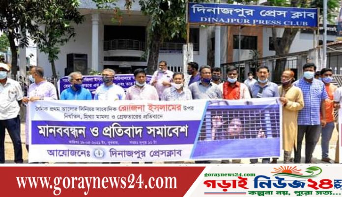 চন্দন মিত্র দিনাজপুরঃ ১৯মে সকালে কালিতলাস্থ দিনাজপুর প্রেসক্লাবের আয়োজনে প্রেসক্লাবের সম্মুখে প্রথম আলোর সিনিয়র সাংবাদিক রোজিনা ইসলামের উপর নির্যাতন এবং মিথ্যে মামলা দিয়ে গ্রেফতারের প্রতিবাদে ও তার নিঃশর্ত মুক্তির দাবীতে মানবন্ধন প্রতিবাদ সমাবেশ অনুষ্ঠিত হয়েছে। উক্ত মানব বন্ধন ও প্রতিবাদ সমাবেশে বক্তারা বলেন “সত্যি বললে বা লিখলে গুরু বেজার”।সত্যি বলার বা লিখার বাকশক্তিকে রুদ্ধ করে দেয়া হয়েছে ডিজিটাল নিরাপত্তা আইন দিয়ে।দেশকে দুর্নীতিমুক্ত করতে হলে সাংবাদিকদের কলমের স্বাধীনতা দিতে হবে।সভা সেমিনারে মঞ্চে উঠে সাংবাদিকদের প্রশংসায় সু উচ্চ স্বরে বলে সাংবাদিকরা সমাজের বিবেক সমাজের দর্পন।এ সব মিথ্যে আশ্বাস আর শান্তনা দিয়ে সাংবাদিকদের লেখনীর চেতনাশক্তিকে আরো স্থবির করে দিয়েছে।দেশ তখনি দূর্নিতিমুক্ত হবে যখন সাংবাদিকদের লেখনি বা বাকশক্তির দ্বার উন্মুক্ত হবে।দেশ ও জনগনের স্বার্থ ও ন্যায্য অধিকার নিয়ে মুখ ফুটে বলতে বা লিখতে পারবে তবেই হয়ে উঠবে দূর্নীতি মুক্ত সমাজ ও দেশ। মন্ত্রী,এমপি,আমলা,পুলিশ তো দুরের কথা এখনত একজন সন্ত্রাসী, পাতী নেতার কুকর্মের ঘটনাও যদি তুলে ধরা হয় সে ডিজিটাল নিরাপত্তা আইনে মামলা বা মানহানির মামলার ভয় দেখায়।এটাই আমাদের বর্তমান প্রেক্ষাপট হয়ে দাড়িয়েছে।এর পিছনে আরেকটি বড় কারন হচ্ছে কিছু তোষামদকারী লেজুর বিত্তি সাংবাদিকের কারনেই আজ সাংবাদিকরা অবহেলিত আর নির্যাতিত। আজকে আমি অমুক তমুক এই পরিচয়টা দশজনের কাছে বিশ্বের কাছে তুলে ধরে পরিচয় করিয়ে দেয় ঐ সাংবাদিক।অথছ এই সাংবাদিকরাই আজ নির্যাতিত।আবহমান কাল থেকে বর্তমান অবদি যত দূর্লোভ ছবি ঘটনা আর প্রামান্য চিত্র দেখেন বা শুনেন তাও ঐ সব ত্যাগী সাংবাদিকেরই অবদান। আর এই সাংবাদিকরাই অনিয়মের সামান্য চিত্র তুলে ধরতে গেলেই হয়ে যান সারথি মহাসারথিরা গুরু বেজার। প্রথম আলোর একজন সিনিয়র সাংবাদিক রোজিনা ইসলাম এমন কি সে অপরাধ করেছিল যে কারনে তাকে শারিরীক নির্যাতনের পর মামলা দেয়া হয়।তাহলে কি কেউ অন্যায় করলে বা দূর্নিতী করে জনগনের সাথে প্রতারনা করলে সে সত্যিটা জানতে চাওয়া যাবে না বা সত্যিটা লিখনীর মাধ্যমে প্রকাশ করা যাবে না।আর করলেই হতে হবে নির্যাতন ও মিথ্যে মামলার স্বীকার।এই কি আমাদের গনতন্ত্র।আজকে যারা দূর্নীতি করছে তার কার সাথে করছে এদেশের সাধারন জনগনের সাথে করছে এদেশের নিরীহ অসহায় গরীব দুখী মানুষের অধিকার থেকে বঞ্চিত করছে আর নিজেরা টাকার পাহাড় গরছে।তাই সাংবাদিকদের ডিজিটাল নিরাপত্তা আইন দিয়ে মিথ্যে মামলা,হামলা করে দমিয়ে রাখা যাবে না।দেশ ও দশের ভাল মন্দ তুলে ধরার দায়িত্ব তুলে ধরতে যেহেতু কলম ধরেছি সেহেতু জীবনের শেষ নিঃশ্বাস পর্য