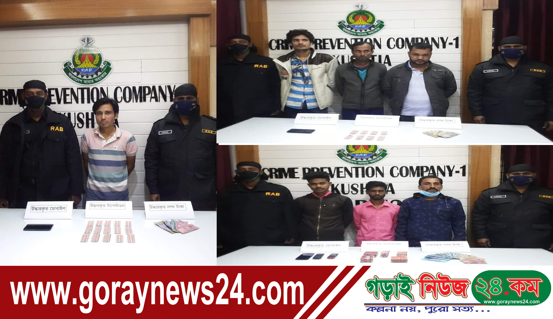 কুষ্টিয়া অফিস, গড়াইনিউজ২৪.কম:: র্যাব-১২, সিপিসি-১, কুষ্টিয়া ক্যাম্পের একটি চৌকষ আভিযানিক দল আজ বুধবার দুপুর ০২:৩০ মিনিট হতে বিকাল ০৫.২০ মিনিট পর্যন্ত ‘‘কুষ্টিয়া জেলার কুষ্টিয়া সদর ও মিরপুর থানা এলাকায়’’ মাদক বিরোধী অভিযান পরিচালনা করে। উক্ত অভিযানে নিষিদ্ধ টাপেন্টাডল ট্যাবলেট-৯৯৬ পিছ, যাহার আনুমানিক মূল্য- ২,৪৯,০০০/- (দুই লক্ষ ঊনপঞ্চাশ হাজার) টাকা, মোবাইল ফোন ০৫টি, সীম ০৬টি, নগদ-৮৯৩০/- টাকা সহ ০৭ জন আসামী ১। মোঃ তাজ উদ্দিন আহমেদ (৩০) পিতাঃ মোঃ জাবেদ ইকবাল, সাং-কবুরহাট মাদ্রাসাপাড়া, থানা- কুষ্টিয়া সদর ২। মোঃ খোকন মীর (৩৫), পিতাঃ মৃত আজমত মীর, সাং- মিনাপাড়া, থানা- কুষ্টিয়া সদর ৩। আজাদ আলী (৩৮), পিতা- মৃত আদম আলী, সাং- কবুরহাট বিশ^াসপাড়া, থানা- কুষ্টিয়া সদর ৪। মোঃ আলী শেখ (২৩), পিতা- রহিম উদ্দিন শেখ, সাং- খয়ের চারা, থানা- মিরপুর ৫। মোঃ খোকন শেখ (৪৫), পিতাঃ মোঃ সিরাজ শেখ, সাং- খয়ের চারা, থানা- মিরপুর ৬। মোঃ বিজন শেখ (২৪), পিতাঃ মোঃ সাহাবুল শেখ, সাং- খয়ের চারা, থানা- মিরপুর, ৭। মোঃ রুবেল শেখ (২৯), পিতা- মৃত নজরুল ইসলাম, সাং- চিথলিয়া খয়ের চারা, থানা-মিরপুর, সর্ব জেলা-কুষ্টিয়া ’কে গ্রেফতার করা হয়। পরবর্তীতে উদ্ধারকৃত আলামত সহ ধৃত আসামীদের বিরুদ্ধে কুষ্টিয়া জেলার সদর ও মিরপুর থানায় মাদক আইনে মামলা দায়ের করা হয়েছে এবং গ্রেফতারকৃত আসামীদের’কে কুষ্টিয়া জেলার সদর ও মিরপুর থানায় সোপর্দ করা হয়েছে। উল্লেখ্য যে, এই ধরণের মাদক বিরোধী অভিযান অব্যাহত রেখে মাদকমুক্ত সোনার বাংলা গঠনে র্যাব-১২, সিপিসি-১, কুষ্টিয়া বদ্ধপরিকর। র্যাব-১২, সিপিসি-১, কুষ্টিয়া’কে তথ্য দিন, মাদক, অস্ত্র ও জঙ্গীমুক্ত বাংলাদেশ গঠনে অংশ নিন।