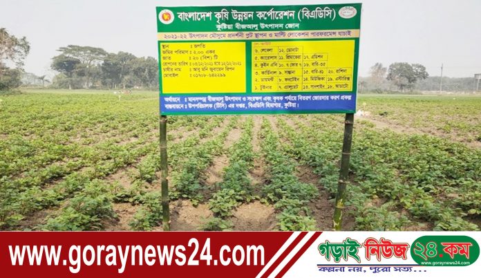 কুষ্টিয়া অফিস, গড়াইনিউজ২৪.কম:: কুষ্টিয়ায় প্রথমবারের মতো বিএডিসি (বাংলাদেশ কৃষি উন্নয়ন কর্পোরেশন) রপ্তানি ও শিল্পের ব্যবহারের উপযোগী ২০টি নতুন জাতের আলুর চাষ করেছে। সদর উপজেলায় প্রায় দুই একর জমিতে পরীক্ষামূলকভাবে এসব জাতের আলুর চাষ করা হয়েছে। প্রচলিত জাতের চেয়ে দ্বিগুণ ফলন ও রোগ প্রতিরোধ ক্ষমতা বেশি হওয়ায় এসব জাতের আলু চাষে আগ্রহ দেখাচ্ছেন কৃষকরা। সরকারের খাদ্য নিরাপত্তার ক্ষেত্রে বিএডিসির এই উদ্যোগ দেশব্যাপী বড় ভূমিকা রাখবে বলে আশা করছেন কৃষি কর্তকর্তারা। এ উপলক্ষে মঙ্গলবার দিনব্যাপী প্লট প্রদর্শনী ও মাল্টি লোকেশন পারফরমেন্স যাচাই এবং মাঠ দিবস অনুষ্ঠানের আয়োজন করা হয়। মাঠ দিবস অনুষ্ঠানে বিএডিসি কুষ্টিয়া অঞ্চলের যুগ্ম-পরিচালক লিয়াকত আলীর সভাপতিত্বে প্রধান অতিথি হিসেবে উপস্থিত ছিলেন কুষ্টিয়া কৃষি সম্প্রসারণ অধিদপ্তরের উপ-পরিচালক সুশান্ত কুমার প্রামাণিক। কুষ্টিয়া বিএডিসি সূত্রে জানা যায়, ২০২১-২২ মৌসুমে কুষ্টিয়া সদর উপজেলার জগতি গ্রামে মাল্টি লোকেশন পারফরমেন্স যাচাইয়ের লক্ষে প্রায় দুই একর জমিতে ২০টি নতুন জাতের আলুর প্রদর্শনী প্লট স্থাপন করে কুষ্টিয়া বিএডিসি হিমাগার। মানসম্মত বীজ আলু উৎপাদন ও সংরক্ষণ এবং কৃষক পর্যায়ে বিতরণ জোরদারকরণ প্রকল্পের অর্থায়নে এসব জাতের আলুর চাষ করা হয়। জাতগুলোর মধ্যে রয়েছে সানশাইন, প্রাডা, সান্তানা, এডিসন, কুইন এনি, ল্যাবেলাসহ আরো কয়েকটি জাত। এসব আলুর ড্রাই ম্যাটার বেশি হওয়ায় রপ্তানি ও শিল্পে ব্যবহার উপযোগী এবং রোগবালাই প্রতিরোধী। বিএডিসির তথ্যমতে বর্তমানে দেশে ৫ লাখ হেক্টর জমিতে ১.৬ কোটি মেট্রিক টন আলু উৎপাদিত হয়। এর মধ্যে দেশের চাহিদা মেটাতে ৮০ লাখ মেট্রিক টন আলু ব্যবহৃত হয়। অবশিষ্ট আলু রোগ বালাইয়ের কারণে বিদেশে রপ্তানি করা সম্ভব হয় না। এসব জাতের আলু চাষ করে বিদেশে রপ্তানি করা সম্ভব হবে। বিএডিসি কুষ্টিয়া হিমাগারের উপ-পরিচালক মুহাম্মদ আশরাফুল আলম জানান, প্রচলিত জাতের আলুর ফলন হেক্টর প্রতি ২০ থেকে ২২ টন। কিন্তু নতুন জাতের আলু ফলন ৪০ টনের বেশি। পুরাতন জাতের চেয়ে নতুন জাতের আলুর ফলন প্রায় দ্বিগুণ। একই খরচে অধিক ফলনের পাশাপাশি জমি কম ব্যবহার করা যাবে।এই কর্মকর্তা মনে করেন, দেশে প্রচলিত পুরাতন জাতের পরিবর্তে বিএডিসির আমদানীকৃত নতুন জাতের আলুর বীজ কৃষক পর্যায়ে ছড়িয়ে দিতে পারলে আলু ফলন বৃদ্ধি পাবে। পাশাপাশি দেশের খাদ্য চাহিদা পূরণ ও রপ্তানির মাধ্যমে দেশের অর্থনীতিতে বিরাট এক মাইলফলক অর্জিত হবে। এই লক্ষ্যে কৃষকদের আগ্রহ বাড়াতে ও পরীক্ষামূলক চাষের ফলন দেখাতে এই মাঠ দিবসের আয়োজন করা হয়। মাঠ দিবস অনুষ্ঠানে বিশেষ অতিথি ছিলেন যুগ্মপরিচালক মো. মোর্শেদুল
