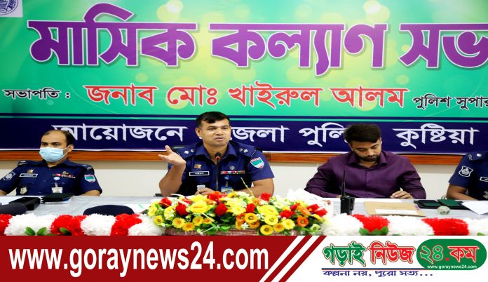 কুষ্টিয়া অফিস, গড়াইনিউজ২৪.কম:: আজ (২০ এপ্রিল ২০২২ খ্রিঃ) তারিখ জেলা পুলিশ কুষ্টিয়ার আয়োজনে পুলিশ লাইন্স সম্মেলন কক্ষে মাসিক কল্যাণ সভা অনুষ্ঠিত হয়। উক্ত মাসিক কল্যাণ সভায় প্রধান অতিথি হিসাবে উপস্থিত ছিলেন জনাব মোঃ খাইরুল আলম, পুলিশ সুপার, কুষ্টিয়া। সভাপতি মহোদয় কল্যাণ সভায় উপস্থিত সকলের উদ্দেশ্যে বিভিন্ন দিক নির্দেশনামুলক বক্তব্য প্রদান করেন। একই সাথে সকলকে মানবিক পুলিশ হতে হবে এবং প্রত্যেকের উপর অর্পিত দায়িত্ব ঈমানী দায়িত্ব মনে করে যথাযথভাবে সঠিক সময়ে পালনের মাধ্যমে জনগণের শতভাগ কল্যাণ নিশ্চিত করতে হবে। সভাপতি মহোদয় মার্চ-২০২২ মাসে অত্র জেলায় বিভিন্ন ইউনিটে কর্মরত পুলিশ সদস্যদের ভাল কাজের স্বীকৃতি স্বরুপ বিভিন্ন পদ মর্যদার পাঁচজন পুলিশ অফিসারকে সনদপত্র, ক্রেস্ট এবং অর্থ পুরস্কারে পুরস্কৃত করেন এবং ইতোপূর্বে অত্র জেলা হইতে অবসর গ্রহণে যাওয়া বিভিন্ন পদ মর্যাদার পুলিশ সদস্যদের হাতে পুলিশ সুপার মহোদয় সম্মাননা স্মারক ও উপহার সামগ্রী তুলে দেন। এসময় আরো উপস্থিত ছিলেন জনাব মোহাম্মদ মোস্তাফিজুর রহমান, অতিরিক্ত পুলিশ সুপার(ক্রাইম অ্যান্ড অপস্), জনাব মোঃ ফরহাদ হোসেন খাঁন, অতিরিক্ত পুলিশ সুপার, জেলা বিশেষ শাখা, কুষ্টিয়া, জনাব মোঃ রাজিবুল ইসলাম, অতিরিক্ত পুলিশ সুপার(প্রশাসন ও অর্থ), কুষ্টিয়া, জনাব মোঃ ইয়াছির আরাফাত, অতিরিক্ত পুশিল সুপার, ভেড়ামারা সার্কেল কুষ্টিয়া, জনাব মোঃ শহীদুজ্জামান,