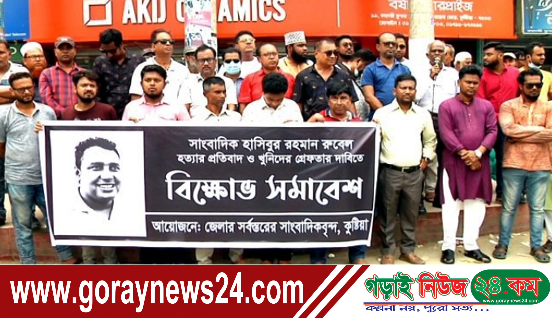 কুষ্টিয়া অফিস, গড়াইনিউজ২৪.কম:: কুষ্টিয়ায় সাংবাদিক রুবেল হত্যার প্রতিবাদ ও জড়িত খুনিদের গ্রেফতার দাবিতে কুষ্টিয়া জেলার সর্বস্তরের সাংবাদিকবৃন্দের ব্যানারে বিক্ষোভ সমাবেশ করেছে সাংবাদিকরা। সোমবার বেলা সাড়ে ১১টায় কুষ্টিয়া শহরের বঙ্গবন্ধু ম্যুরাল চত্বরে এডিটরস ফোরামের সভাপতি মজিবুল শেখের সভাপতিত্বে অনুষ্ঠিত সমাবেশে জেলা ও উপজেলার সাংবাদিক নেতৃবৃন্দসহ বিভিন্ন সামাজিক ও সাংস্কৃতিক সংগঠনের নেতৃবৃন্দ সংহতি জানায়। নেতৃবৃন্দ সাংবাদিক রুবেল হত্যাকান্ডের ঘটনায় তীব্র নিন্দা ও প্রতিবাদ জানানোসহ হত্যাকান্ডে জড়িত খুনিদের গ্রেফতার দাবি করেছে কুষ্টিয়ার সর্বস্তরের সাংবাদিকবৃন্দের নেতৃবৃন্দ। নৃসংশ এই হত্যাকান্ডের দুই সপ্তাহ পেরিয়ে গেলেও এখনও পুলিশ ও মামলার সংশ্লিষ্ট তদন্তকারী সংস্থার পক্ষ থেকে এঘটনায় নূন্যতম সন্তোষজনক কোন তথ্য উপস্থাপনে ব্যর্থ হওয়ায় চরম ক্ষোভ প্রকাশ করেছেন। আন্দোলনের সমন্বয়ক কুষ্টিয়া এডিটরস ফোরামের সভাপতি মজিবুল শেখ অবিলম্বে সাংবাদিক রুবেল হত্যার রহস্য উন্মোচনসহ জড়িতদের গ্রেফতারের দাবি করেন। অন্যথায় এবার কাফন মিছিলসহ আবারও লাগাতার কঠোর কর্মসূচী গ্রহন করা হবে বলে জানিয়েছেন। আগামীতে ঢাকাস্থ জাতীয় প্রেসক্লাব চত্বরে কাফনের কাপড় পরিহিত মিছিলসহ স্বরাষ্ট্র মন্ত্রনালয় ঘেরাও কর্মসূচী পালন করা হবে। কুষ্টিয়া টিভি জার্নালিষ্ট এসোসিয়েশনের সভাপতি কুষ্টিয়া প্রেস কøাবের নির্বাহী সদস্য হাসান আলীর স ালনায় বক্তব্য রাখেন, এডিটরস ফোরামের সাধারণ সম্পাদক কুষ্টিয়ার কাগজের প্রকাশন সম্পাদক এসএ টিভির প্রতিনিধি নুর আলম দুলাল, কুষ্টিয়া প্রেস ক্লাবের সহসভাপতি রবি বার্তার প্রকাশক সম্পাদক গোলাম মওলা, নির্বাহী সদস্য মাই টিভির কুষ্টিয়ার প্রতিনিধি কুষ্টিয়া সাংবাদিক ইউনিয়নের সভাপতি আব্দুর রাজ্জাক বাচ্চু, প্রথম আলোর নিজস্ব প্রতিবেদক তৌহিদী হাসান শিপলু, নিউজ টুয়েন্টি ফোরের স্টাফ রিপোর্টার জাহিদুজ্জামান, চ্যানেল টুয়েন্টি ফোর টিভির স্টাফ রিপোর্টার শরীফ বিশ^াস, কুষ্টিয়া প্রেসক্লাব কেপিসি ও সাংবাদিক ইউনিয়ন কুষ্টিয়ার সভাপতি রাশিদুল ইসলাম বিপ্লব, সাধারণ সম্পাদক মাহমুদ হাসান, কুষ্টিয়া প্রেসক্লাব কেপিসির সাধারণ সম্পাদক গাজী টিভির প্রতিনিধি সোহেল রানা, কুমারখালী কাঙাল হরিনাথ মজুমদার প্রেসক্লাবের সভাপতি কেএমআর শাহিন, সম্মিলিত সামাজিক আন্দোলন কেন্দ্রীয় কমিটির সদস্য কারশেদ আলম প্রমুখ। এদিকে সাংবাদিক রুবেল হত্যা মামলায় সন্দেহজনক দুইজনকে গ্রেফতারের দাবি করেছে র্যাব-১২, সিপিসি-১ কুষ্টিয়া ক্যাম্পের কোম্পনী কমান্ডার স্কোয়াড্রন লীডার মোহাম্মদ ইলিয়াস খান। শনিবার সন্ধা সোয়া ৬টায় র