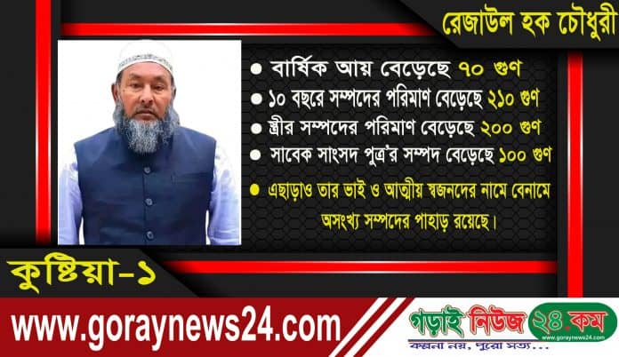 কুষ্টিয়া অফিস, গড়াইনিউজ২৪.কম:: কুষ্টিয়া-১(দৌলতপুর) আসনের সাবেক সাংসদ রেজাউল হক চৌধুরীর মালিকানাধীন ২ বিঘা জমির মূল্য ২০ হাজার টাকা,১ টা বাণিজ্যিক গোডাউনের মূল্য ৮০ হাজার টাকা। স্ত্রীর নামে রয়েছে ৫ বিঘা জমির মূল্য ৫০ হাজার টাকা। দৌলতপুর উপজেলার আল্লারদর্গা হলুদবাড়ী বাজারের ৪ তলা মার্কেট আবাসিক বাড়ি হিসেবে দেখানো হয়েছে। যার মূল্য ৬০ লাখ টাকা উল্লেখ করা হয়েছে। এছাড়াও বিলাস বহুল বাড়ী, নোহা গাড়ী,বিদেশে রেস্টুরেন্ট ব্যবসা, স্বর্ণের তথ্য গোপন এবং প্রচলিত বাজার মূল্যের চেয়ে কম মূল্য দেখিয়ে শতকোটি টাকার সম্পদের তথ্য গোপন করেন সাবেক এই সাংসদ।