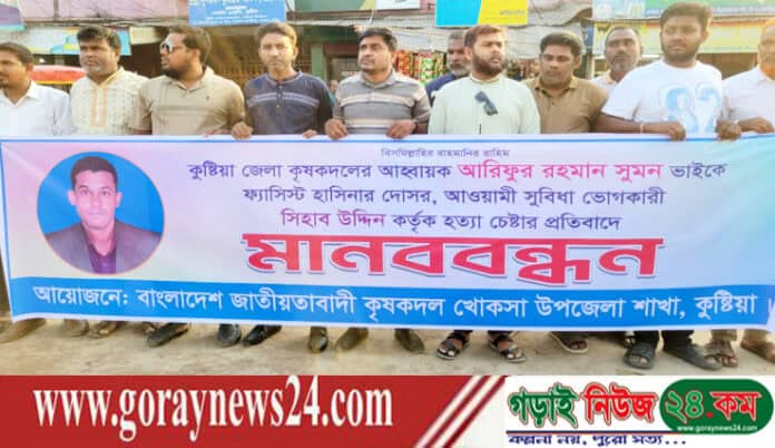 কুষ্টিয়া অফিস, গড়াইনিউজ২৪.কম:: কুষ্টিয়া জেলা কৃষকদলের আহবায়ক আরিফুর রহমান সুমনের ওপর হামলার প্রতিবাদে মানববন্ধন অনুষ্ঠিত হয়েছে। আজ শুক্রবার (১০ এপ্রিল ) বিকেলে খোকসা বাসস্ট্যান্ড এলাকায় এ কর্মসূচির আয়োজন করে বাংলাদেশ জাতীয়তাবাদী কৃষকদল, খোকসা উপজেলা শাখা। মানববন্ধনে বক্তারা অভিযোগ করেন, কুষ্টিয়া জেলা কৃষক দলের আহ্বায়ক আরিফুর রহমান সুমনের ওপর পরিকল্পিতভাবে হত্যার উদ্দেশ্যে হামলা চালানো হয়েছে। তারা দাবি করেন, আওয়ামী লীগের সুবিধাভোগী ও ‘ফ্যাসিস্ট হাসিনার দোসর’ হিসেবে পরিচিত শিহাব উদ্দিন এ হামলার সঙ্গে জড়িত। বক্তারা অবিলম্বে অভিযুক্তদের গ্রেপ্তার করে দৃষ্টান্তমূলক শাস্তির দাবি জানান। পাশাপাশি এ ধরনের রাজনৈতিক সহিংসতা রোধে প্রশাসনের কার্যকর হস্তক্ষেপ কামনা করেন। খোকসা উপজেলা কৃষক দলের সদস্য সচিব জাহাঙ্গীর আলম বলেন, “সুমন ভাইয়ের নিরাপত্তা নিশ্চিত করতে কুষ্টিয়ার উচ্চপদস্থ কর্মকর্তাদের জরুরি দৃষ্টি আকর্ষণ করছি। একই সঙ্গে অভিযুক্ত শিহাব উদ্দিনকে দ্রুত আইনের আওতায় আনার দাবি জানাচ্ছি।” একই দাবি জানান উপজেলা কৃষক দলের আহ্বায়ক রফিক মন্ডল। মানববন্ধনে আরও উপস্থিত ছিলেন খোকসা উপজেলা কৃষক দলের যুগ্ম আহ্বায়ক আব্দুল্লাহ আল মামুন, আবুল কালাম আজাদ, জাহাঙ্গীর বাবু, সদস্য বেলাল হোসেন, শরিফুল ইসলামসহ বিভিন্ন স্তরের নেতাকর্মী ও সাধারণ মানুষ। কর্মসূচি থেকে ভবিষ্যতে আরও কঠোর আন্দোলনের হুঁশিয়ারি দেওয়া হয়।