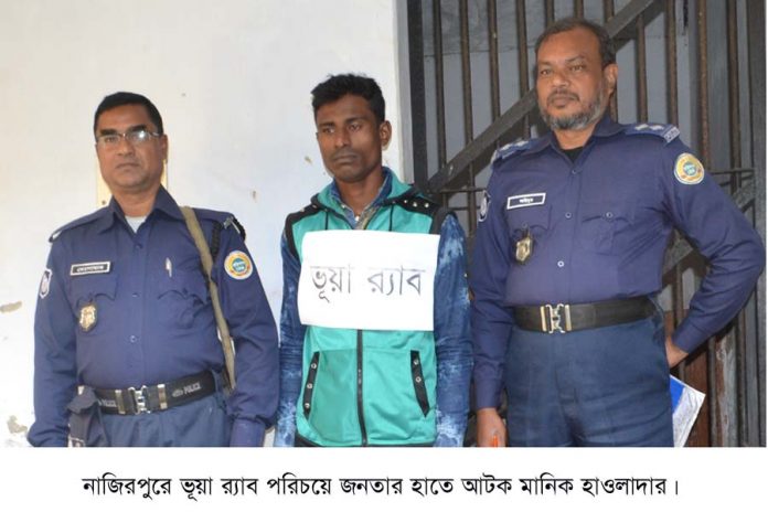 এস.এম. সাইফুল ইসলাম কবির, নাজিরপুর থেকে ফিরে,গড়াইনিউজ২৪.কম:: পিরোজপুরের নাজিরপুরে র্যার পরিচয়ে প্রতারণার অভিযোগে নাজিরপুর থানা পুলিশ মানিক হাওলাদার (২৮) নামে একজনকে গ্রেফতার করেছে। গ্রেফতারকৃত মানিক ঝালকাঠী সদর উপজেলার দিবাকরকাঠী গ্রামের নুরুল ইসলাম হাওলাদারের ছেলে। থানা পুলিশ সূত্রে জানা গেছে, উপজেলার এসএস খেজুরতলা মাধ্যমিক বিদ্যালয়ের প্রধান শিক্ষক শংকর প্রসাদ রায়ের সাথে একই বিদ্যালয়ের সহকারি প্রধান শিক্ষক শংকর কুমার মিস্ত্রীর স্কুল ম্যানেজিং কমিটি গঠন নিয়ে দ্বিমত সৃষ্টি হয়। এ ঘটনাকে কেন্দ্রে করে পিরোজপুর সদর উপজেলার নন্দিপাড়া গ্রামের যদু নাথ দাসের ছেলে পার্থ দাসের পরিকল্পনায় গত বুধবার দুপুরে আটক মানিক র্যার পরিচয়ে প্রধান শিক্ষক শংকর প্রসাদ রায়ের বাড়ীতে গিয়ে তাকে খোঁজা-খুঁজি করে। তাকে বাড়ীতে না পেয়ে মোবাইলে ফোন করে তার অবস্থান জানতে চায় এবং ওই প্রধান শিক্ষক বিভিন্ন অপকর্মের সাথে জড়িত বলে তদন্তের জন্য তার সাথে দেখা করতে বলে। এক পর্যায়ে ওই দিন বিকেলে উপজেলা সদরে এসে আটক মানিক প্রধান শিক্ষক শংকরের সাথে দেখা করে নিজেকে র্যারের কর্মকর্তা পরিচয় দেয় এবং তাকে হয়রানির চেষ্টা করে। এ সময় স্থানীয়দের সন্দেহ হলে তারা মানিককে আটক করে থানায় সোর্পদ করে। নাজিরপুর থানার অফিসার ইনচার্জ (ওসি) মো. হাবিবুর রহমান জানান, র্যার পরিচয়ে প্রতারণার অভিযোগে প্রধান শিক্ষক শংকর প্রসাদ রায় বাদী হয়ে একটি মামলা দায়ের করেছে। আটক মানিককে ওই মামলায় গ্রেফতার করে আদালতে প্রেরণ করা হয়েছে।