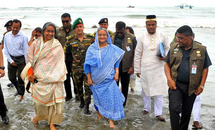 গড়াইনিউজ২৪.কম:: প্রধানমন্ত্রীর কক্সবাজার সফরে ব্যস্ততম শিডিউলে কিছুক্ষণের জন্য থমকে গেছিল। নির্ধারিত অনুষ্ঠান শেষে প্রধানমন্ত্রীর ইচ্ছা হয় সমুদ্রের পানিতে পা ভেজানোর। যা ভাবা তাই কাজ। প্রধানমন্ত্রী চলে যান সৈকতের পাশে অগভীর পনিতে। ইনানী সৈকতে থাকার  সময়টুকু প্রধানমন্ত্রীকে বেশ উচ্ছ্বসিত দেখাচ্ছিল। শনিবার কক্সবাজার-টেকনাফ ৮০ কিলোমিটার দীর্ঘ মেরিন ড্রাইভ উদ্বোধন করতে প্রধানমন্ত্রী ইননী সৈকতে আসেন। সেখানকার বে ওয়াচ রিসোর্টের সামনে সৈকতের বেলাভূমিতে মঞ্চ করে হয় এই অনুষ্ঠানটি। দুপুর সাড়ে ১২টায় অনুষ্ঠান শেষ হলে শেখ হাসিনা সোজা সৈকতে নেমে যান। সেখানে কিছুক্ষণ খালি পায়ে হাঁটেন তিনি, নামেন পানিতেও। অনুষ্ঠানের বক্তব্যে শেখ হাসিনা জাতির পিতা বঙ্গবন্ধু শেখ মুজিবুর রহমানের সঙ্গে শৈশবে সমুদ্র দেখার অভিজ্ঞতার কথা জানান। ইনানীর সঙ্গে জড়িয়ে আছেন বঙ্গবন্ধুর স্মৃতিও। ১৯৫৮ সালে সামরিক শাসনামলে অরণ্যঘেরা ইনানীর চেনছড়ি গ্রামে বেশ কিছু দিন ছিলেন বাংলাদেশের জাতির জনক। এসময় বাংলাদেশের প্রধান পর্যটন শহর কক্সবাজারকে আরও আকর্ষণীয়ভাবে গড়ে তোলার কথাও বলেন শেখ হাসিনা। সকালে বিমানের বোয়িং উড়োজাহাজ মেঘদূত-এ কক্সবাজার নামার পর ইনানী সৈকতে যান প্রধানমন্ত্রী। এর মধ্য দিয়ে সেখানে বোয়িং বিমান চলাচল শুরু হল।