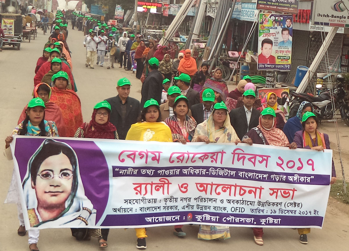 কুষ্টিয়া অফিস, গড়াইনিউজ২৪.কম:: কুষ্টিয়া পৌরসভায় “নারীর তথ্য পাওয়ার অধিকার-ডিজিটাল বাংলাদেশ গড়ার অঙ্গিকার” শীর্ষক বিষয়কে সামনে রেখে বেগম রোকেয়া দিবস উপলক্ষে র্যালি অনুষ্ঠিত হয়েছে। আজ মঙ্গলবার সকালে কুষ্টিয়া পৌরসভার আয়োজনে তৃতীয় নগর পরিচালন ও অবকাঠামো উন্নতিকরণ (সেক্টর) প্রকল্পের সহযোগীতায় পৌরসভায় প্রণীত জেন্ডার একশন প্ল্যানের আওতায় সচেতনতামূলক কার্যক্রমের অংশ হিসেবে এই র্যালি অনুষ্ঠিত হয়। র্যালিটি পৌর বিজয় উল্লাস চত্বর থেকে বের হয়ে শহরের প্রধান সড়ক এন.এস. রোড প্রদক্ষিণ করে কুষ্টিয়া পৗরসভায় শেষ হয়। ব্যানার, ফেস্টুন, ক্যাপ ও বাদ্যযন্ত্র নিয়ে কুষ্টিয়া পৌরসভার কাউন্সিলর, কর্মকর্তা-কর্মচারী সহ বিভিন্ন শ্রেণী পেশার মানুষ এই র্যালিতে অংশগ্রহন করেন। র্যালিতে উপস্থিত ছিলেন কুষ্টিয়া পৌরসভার কাউন্সিলর সাবা উদ্দিন সওদাগর, রিনা নাসরিন, নির্বাহী প্রকৌশলী রবিউল ইসলাম, সচিব কামাল উদ্দিন, সহকারী প্রকৌশলী ওয়াহিদুর রহমান, আবুল কাশেম, নগর পরিকল্পনাবিদ রানভীর আহমেদ, বস্তি উন্নয়ন কর্মকর্তা এ. কে. এম. মঞ্জুরুল ইসলাম, উপ-সহকারী প্রকৌশলী সাবিনা ইসলাম, শামসুজ্জামান, জাহাঙ্গীর আলম, ফিরোজ আজম, নক্সাকার আজম আলী, এসেসর আমান উল্লাহ, কুষ্টিয়া পৌরসভা এমপ্লয়িজ ইউনিয়নের সভাপতি গোলাম ছারয়ার, কুষ্টিয়া পৌরসভার বাস্তবায়নাধীন আরবান প্রাইমারী হেল্থ কেয়ার এন্ড সার্ভিস ডেলিভারী প্রকল্পের কর্মকর্তা-কর্মচারী সহ গণ্যমান্য ব্যক্তিবর্গ। সংবাদ বিজ্ঞপ্তি